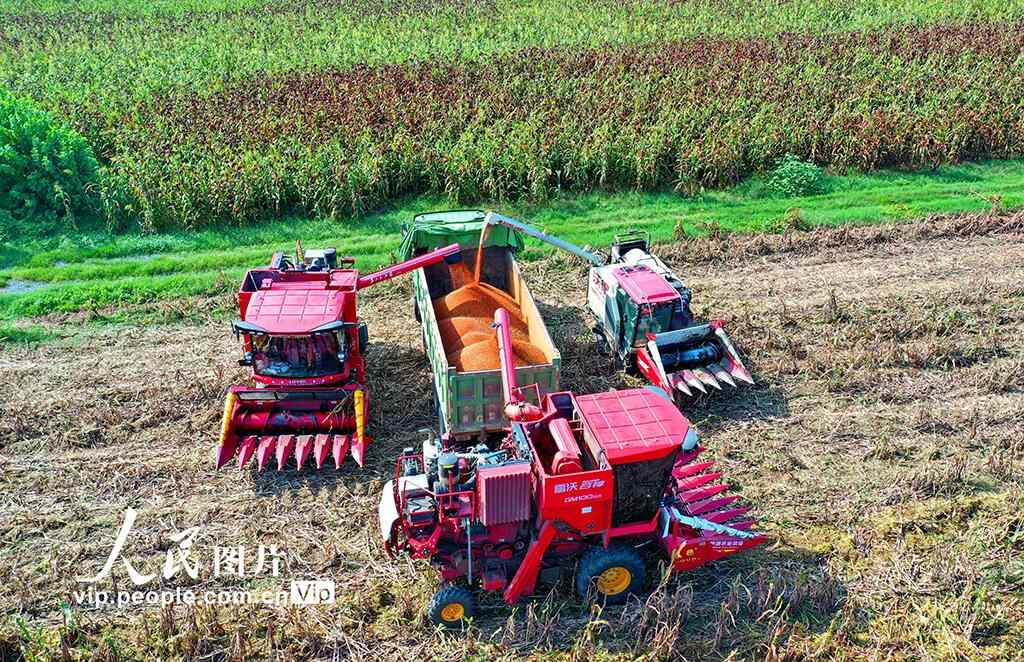 金秋十月,江西省九江市彭泽县棉船镇的近万亩红高粱迎来丰收季,收割机在田间来回穿梭,整个种植基地呈现出一派繁忙的丰收景象。近年来,当地不断优化农业产业结构,因地制宜发展油菜、小麦、大豆、高粱等作物种植,走规模化、机械化、订单化的现代农业发展路径,持续提高耕地产出效益,促进农民增收,助力乡村全面振兴。朱海鹏摄(人民图片网)