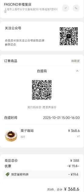 9月22日,市民叶女士在长宁区番禺路381号幸福里F座101室FASCINO BAKERY(幸福里店)内下单了一只8吋栗子咖啡蛋糕,实付368.6元。“栗子加咖啡,这是外婆中意的款式。”