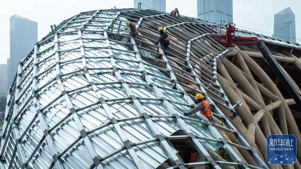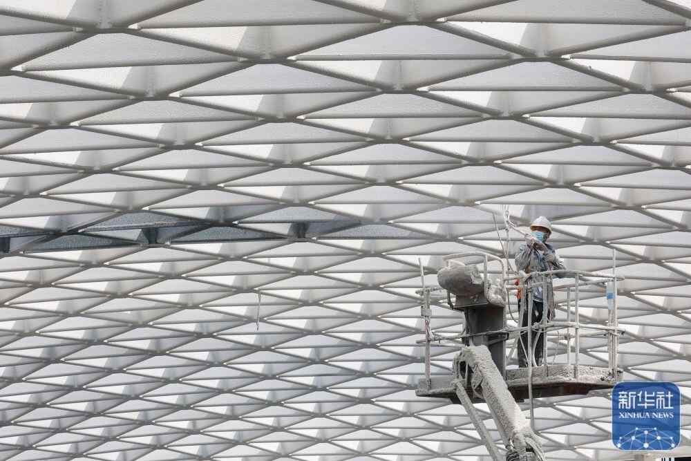 ↑ 10月1日,在江苏省无锡市奥体中心三期项目现场,中建二局工人对钢结构进行防火涂料喷涂作业。新华社发(朱吉鹏摄)