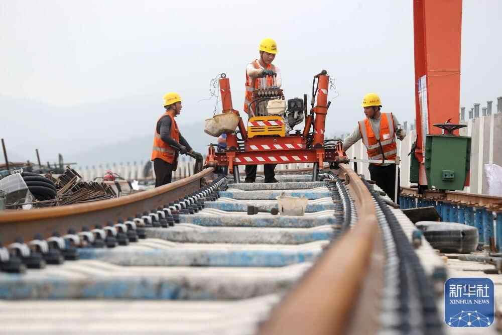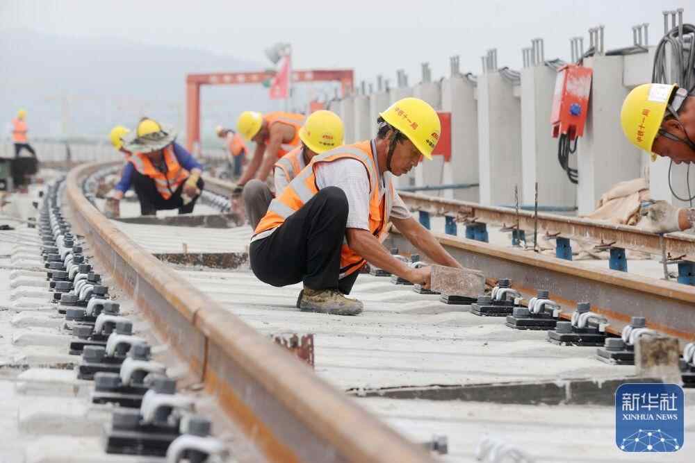 ↑ 10月1日,中铁十一局建设者在浙江省湖州市德清县杭德市域铁路高架线铺轨现场施工作业。新华社发(谢尚国摄)