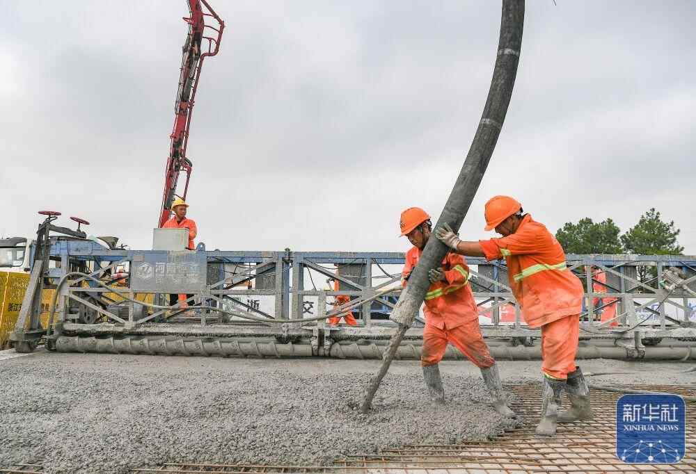 ↑ 10月1日,在浙江省金华市甬金衢上高速公路金华城区段工地,施工人员在浇筑混凝土。新华社发(时宽兵摄)