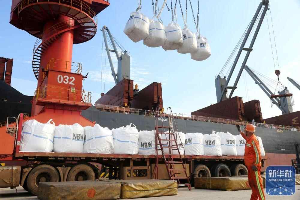 ↑ 10月1日,码头工人在江苏省连云港港东方港务分公司码头上忙碌。新华社发(王春摄)