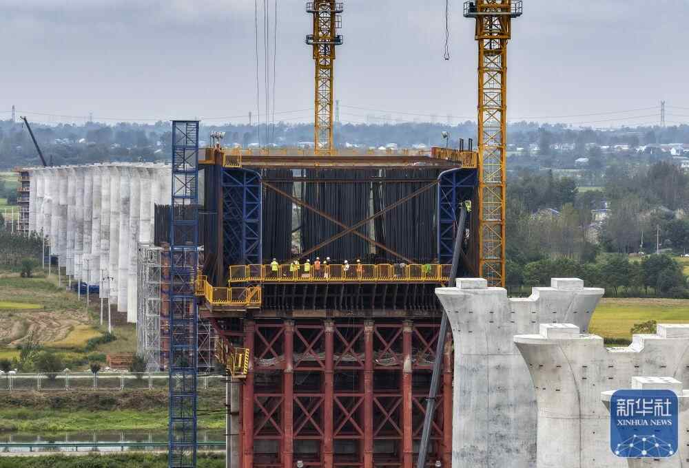 ↑ 10月1日,中铁十局工人在合武高铁一标庐安特大桥跨淠河总干渠连续梁拱施工现场作业(无人机照片)。新华社发(刘玉才摄)