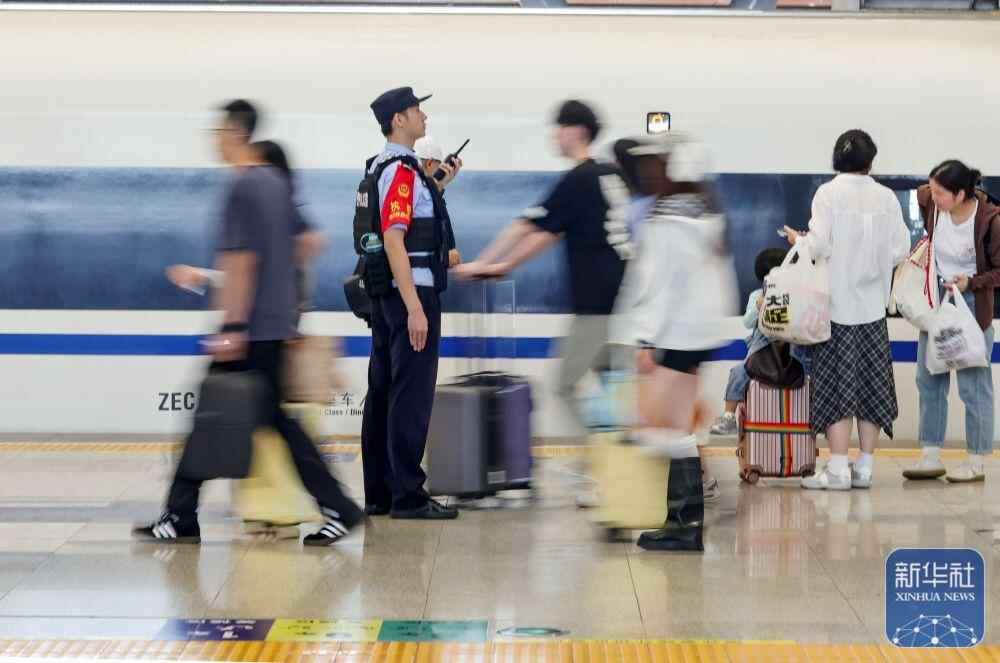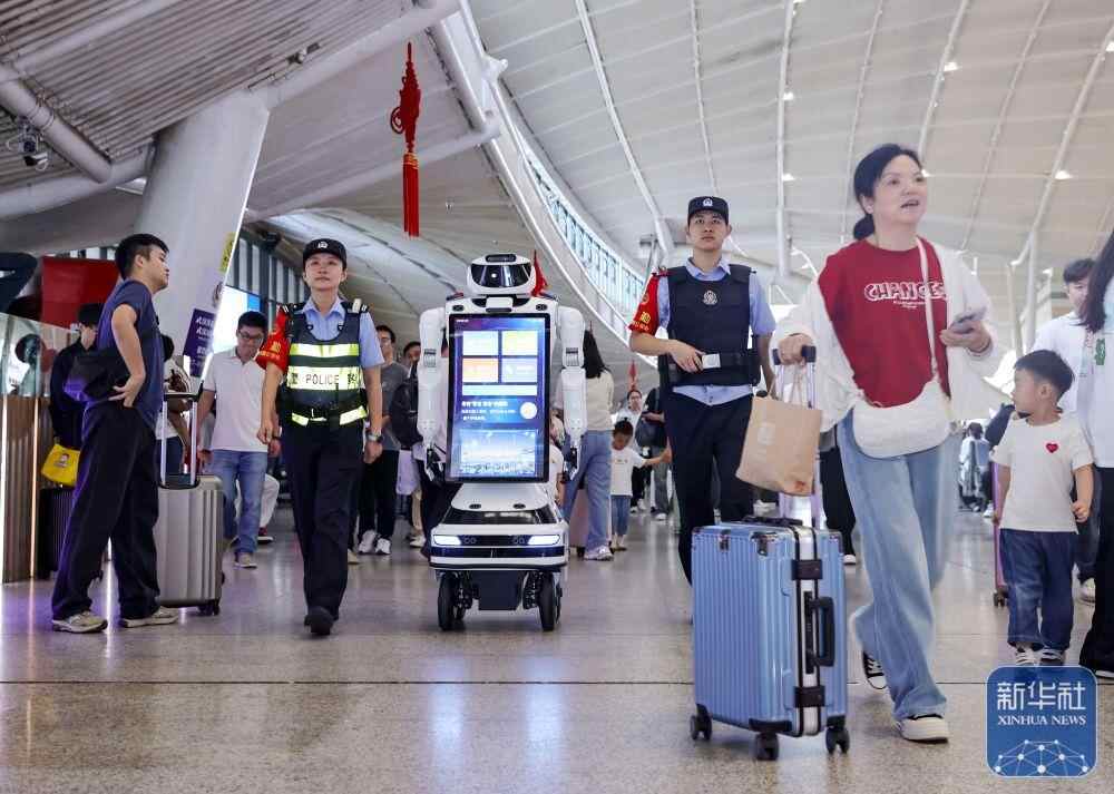 ↑ 10月1日,武汉铁路公安处武汉站派出所民警在武汉站巡查。新华社发(赵军摄)