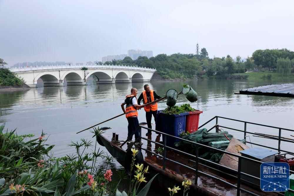 ↑ 10月1日,四川省眉山市东坡区环卫工人在东坡湖上打捞水草。新华社发(姚永亮摄)