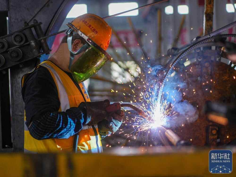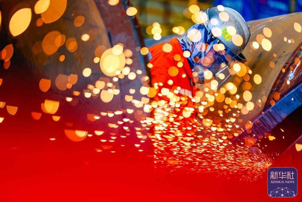 ↑ 10月1日,在湖南省衡阳市衡山县经济开发区,恒岳重钢钢结构工程有限公司员工进行风电塔筒的部件加工作业。新华社发(曹正平摄)