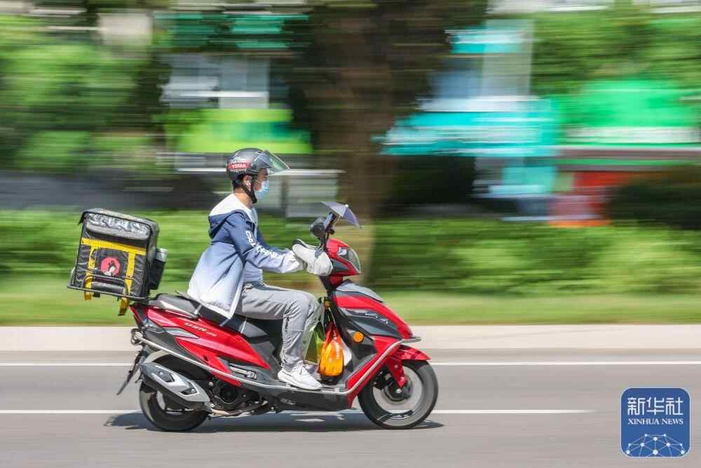 ↑ 10月1日,在重庆市渝北区,一名外卖小哥在辛勤工作。新华社记者 黄伟 摄
