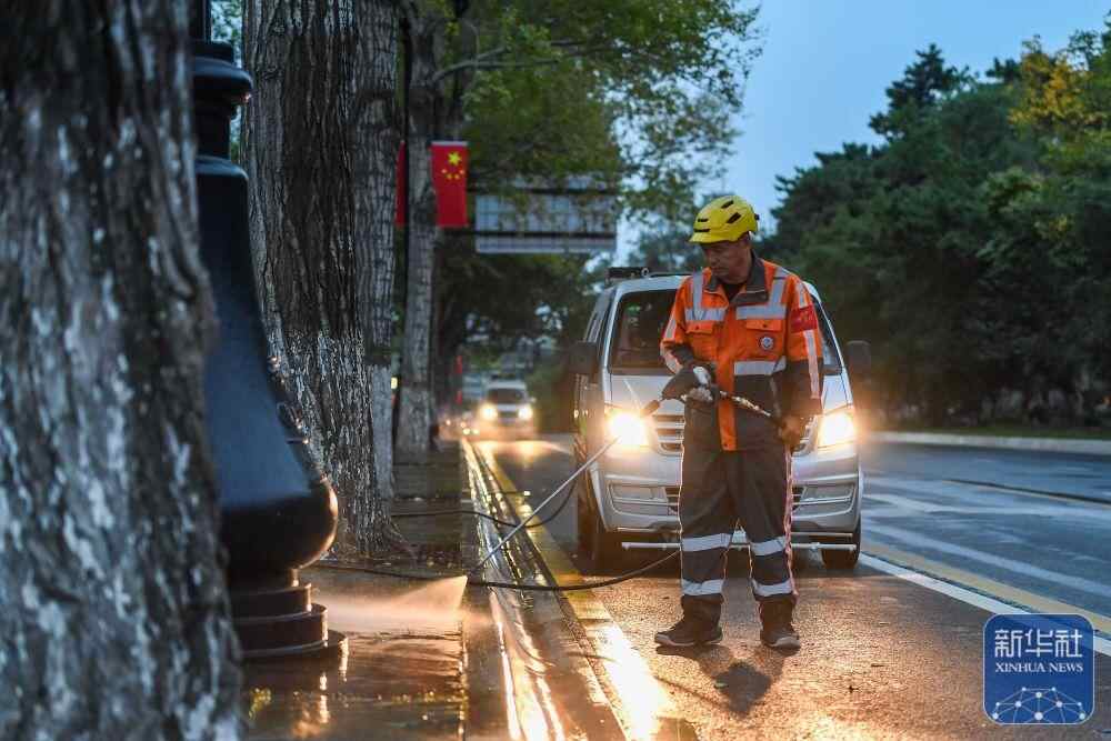 ↑ 10月1日,河北省石家庄市新华区环卫工人在中华大街进行道路晨扫工作。新华社发(梁子栋摄)