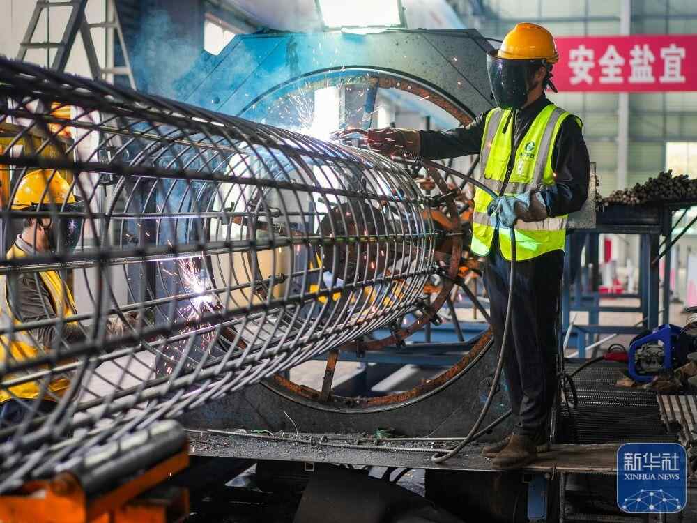 ↑ 10月1日,工人在位于江苏省兴化市陈堡镇的中铁上海工程局盐宜铁路项目部钢筋加工场进行焊接作业。新华社发(周社根摄)