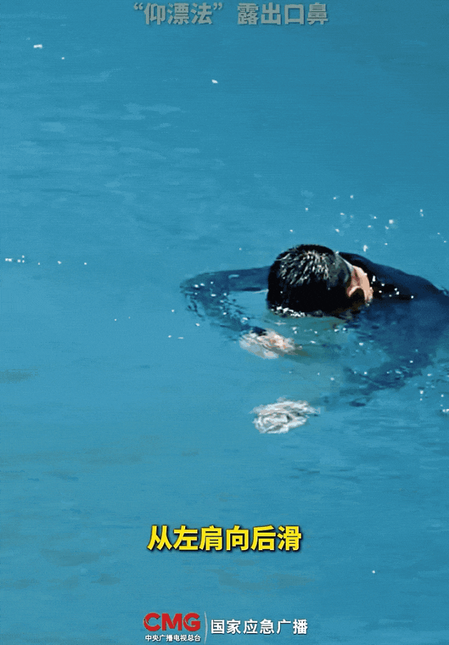 2.切记手出水面头必沉,可将双手举过头顶,这样重心会向上移动,帮助身体仰躺在水面。抬起下巴,让口鼻露出水面,保证呼吸,同时大声呼救。