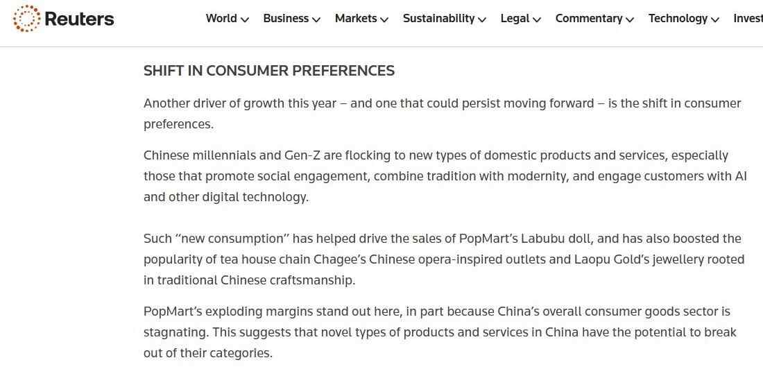 作者认为,中国经济增长的另一个驱动力是消费者偏好的转变。中国千禧一代和 Z 世代正涌向新型国内产品和服务,那些可以促进社会参与、将传统与现代相结合、并通过人工智能和其他数字技术吸引客户的产品和服务尤其受到欢迎,这种“新消费”推动了泡泡玛特拉布布娃娃的销售,也提升了茶馆连锁店“霸王茶姬”的中国戏曲主题门店和一些源于中国传统工艺的珠宝的知名度,不仅如此,这些新兴的产品和服务类型还具备潜力,能够突破现有类别。