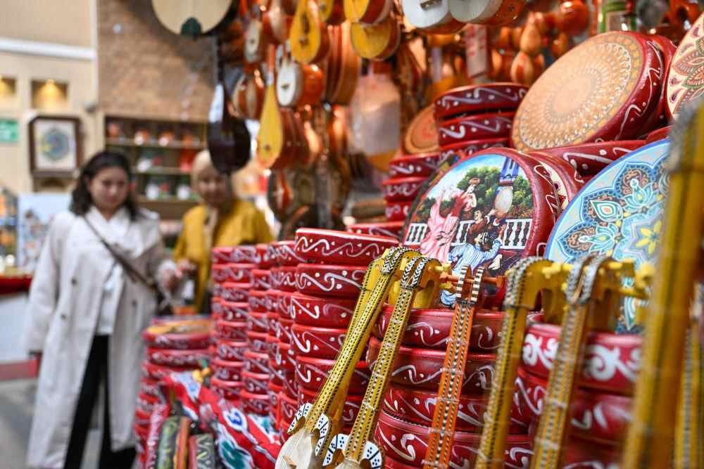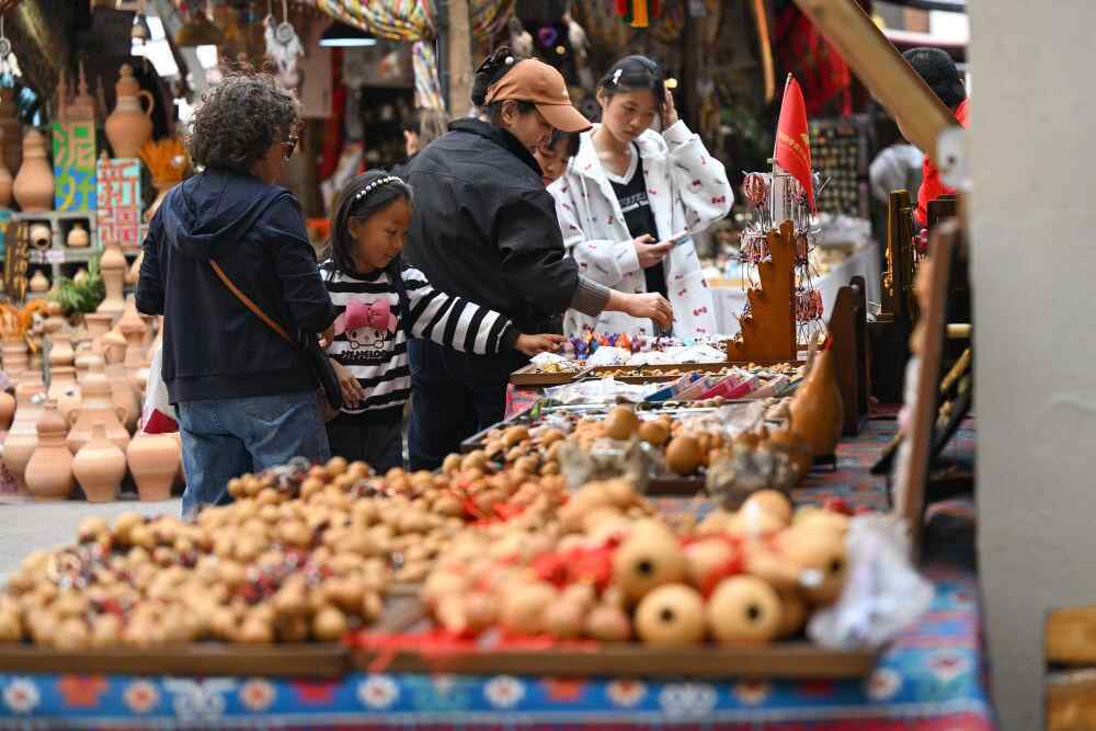 ↑ 10月1日,游客在新疆国际大巴扎挑选商品。