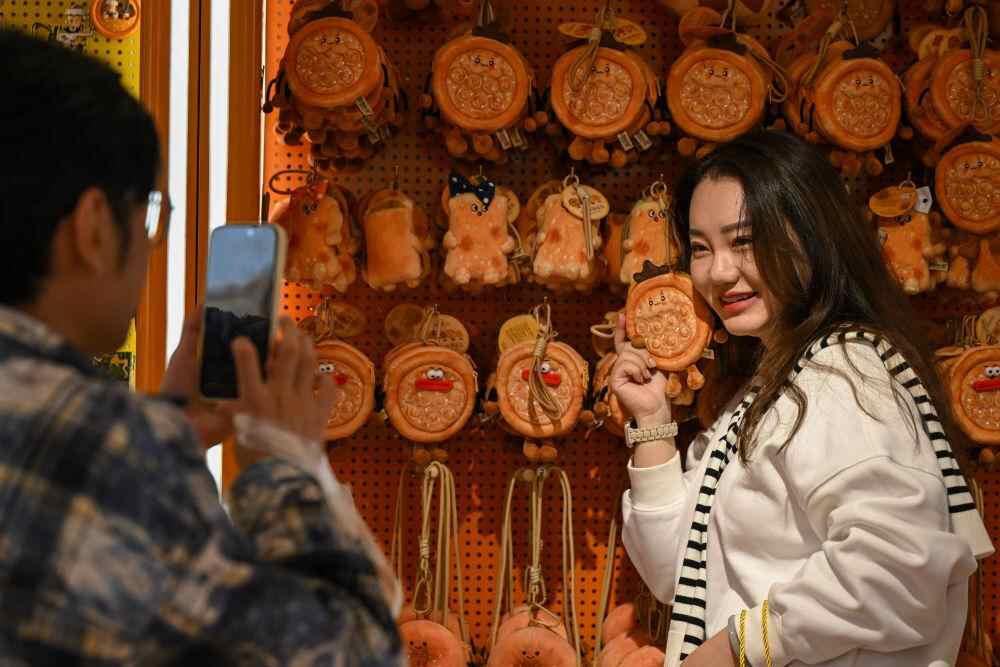 ↑ 10月1日,游客在新疆国际大巴扎体验旅拍。