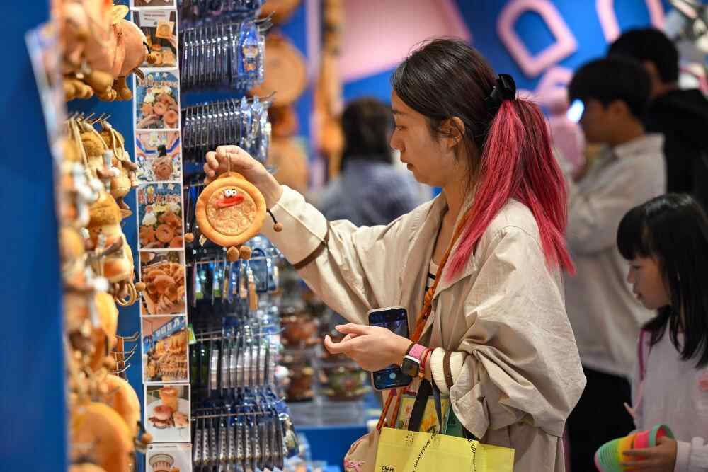 ↑ 10月1日,游客在新疆国际大巴扎选购饮品。
