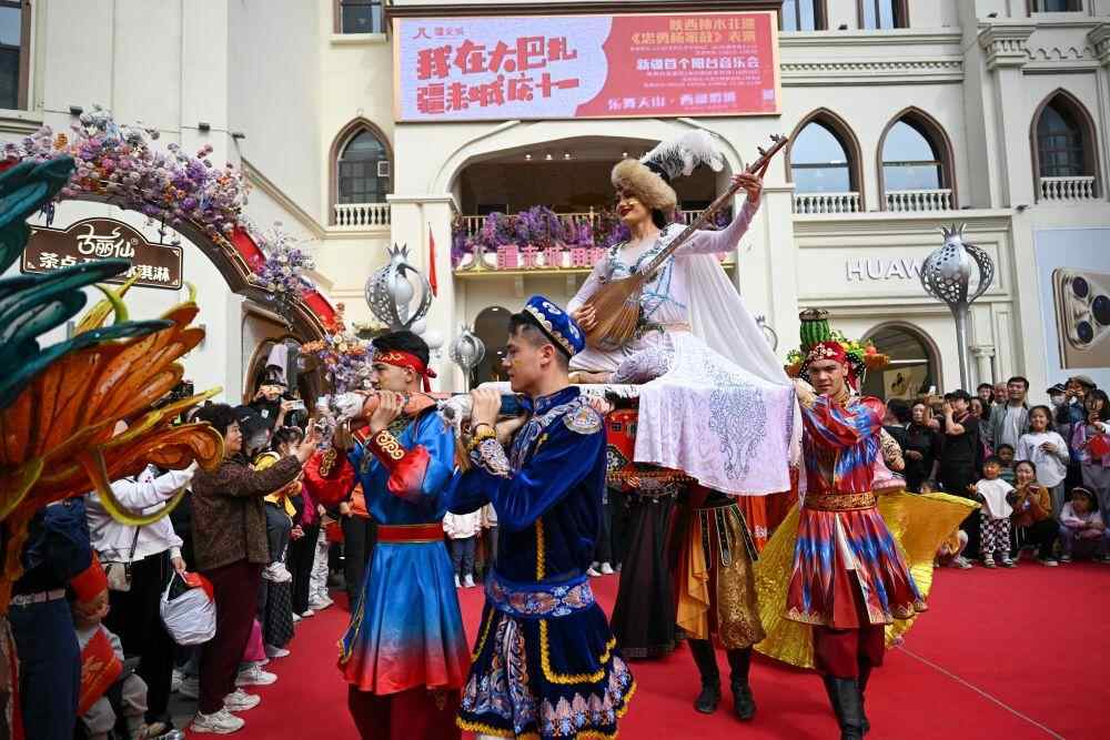 ↑ 10月1日,在新疆乌鲁木齐市新疆国际大巴扎,演员进行开街表演。