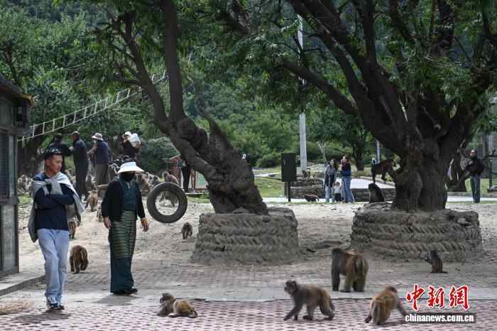 图为林则村的林则生态文化旅游景区里游客给藏猕猴喂饼干。中新社记者 贡嘎来松 摄