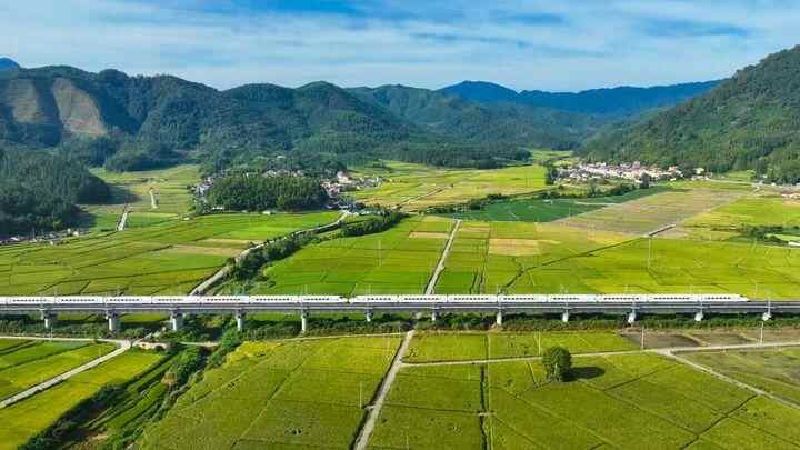 2025年9月29日,动车组列车疾驰在向莆铁路福建三明段(无人机照片)。新华社发(张海根 摄)