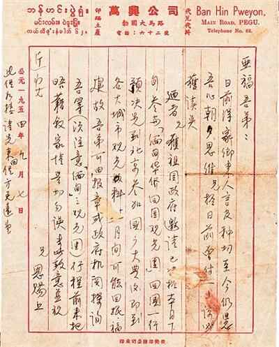 廼者兄获祖国政府邀请,已决于本月下旬参与“缅甸华侨回国观光团”回国一行,预决先到北京参加国庆大典,后即到各大城市观光,料十一二月间可能回抵福建,故吾弟可由报章或政府机关探询吾等(须注意“缅甸”之观光团)行程,前来把晤,藉叙家情,是切勿误。