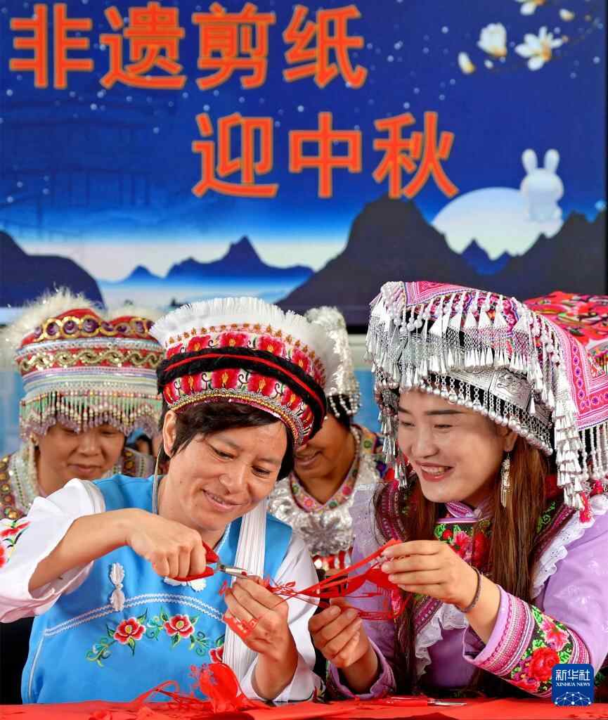 9月30日,江苏省海安市墩头镇宝祥村少数民族职工在学剪中秋节主题剪纸作品。