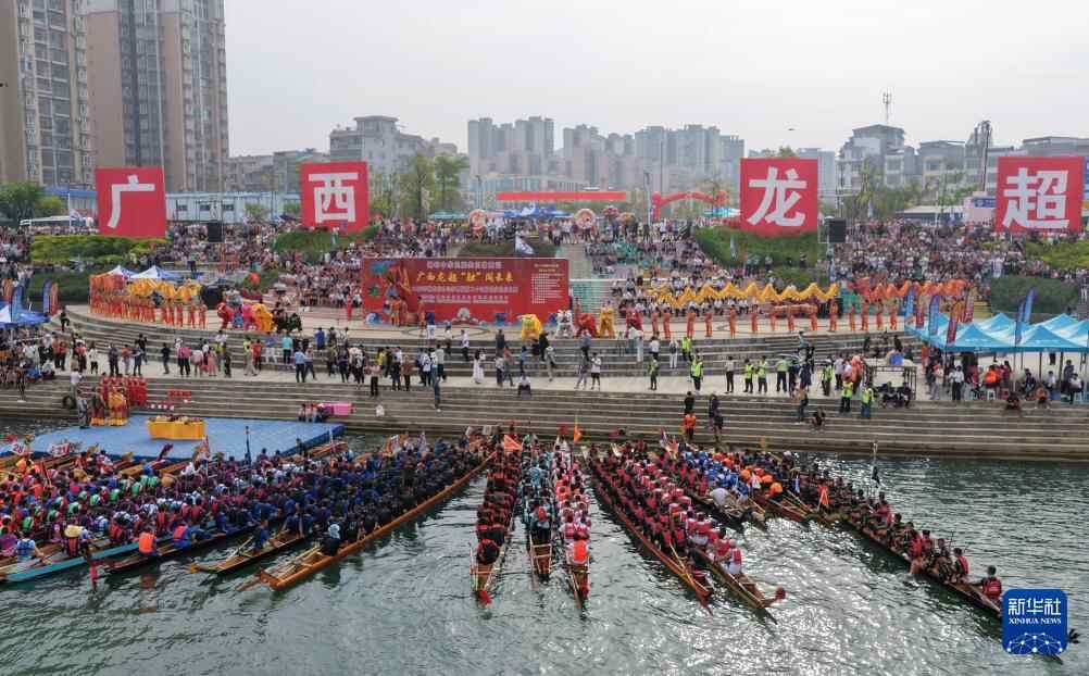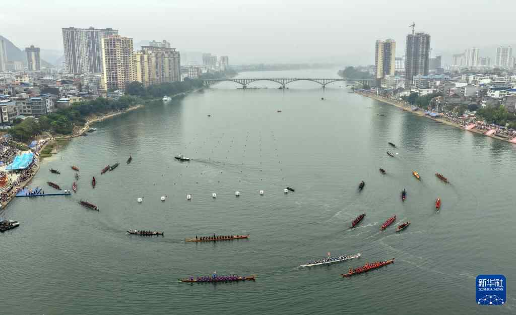 9月30日,在广西柳州市融安县迎国庆龙舟大赛中,参赛队伍在比赛中(无人机照片)。
