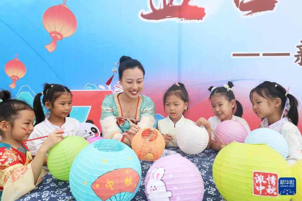 9月29日,河北省唐山市丰润区新城道幼儿园举行的“花好月圆 古韵迎中秋”主题活动中,小朋友在老师的指导下学习彩绘灯笼。