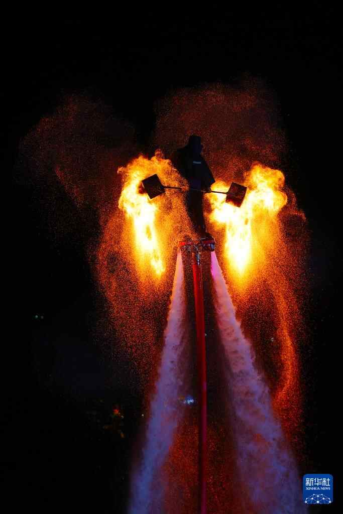 9月29日晚,在重庆市黔江区武陵水岸,民间艺人在水上表演非遗火壶。