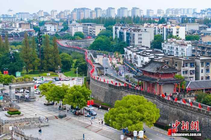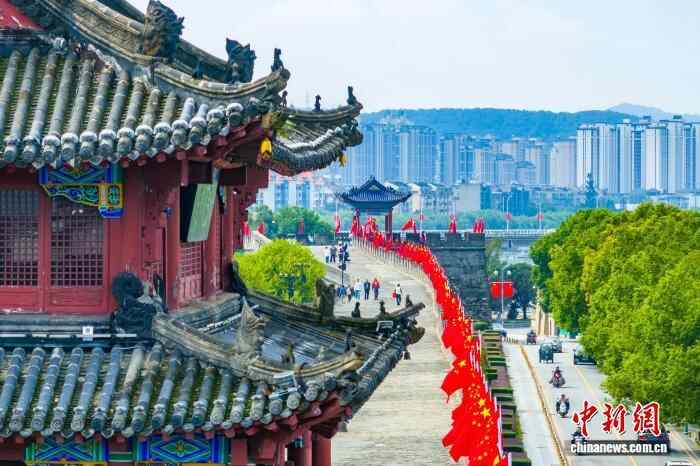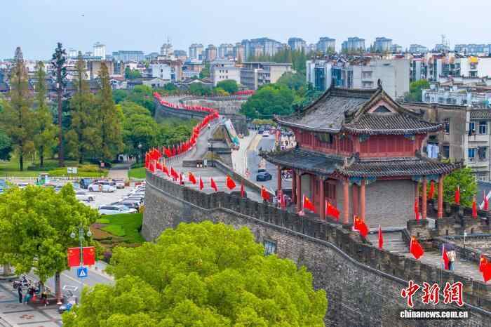 图为襄阳古城墙挂上国旗。(无人机照片)张倩龙 摄