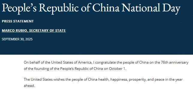 据参考消息,美国当地时间9月30日,美国国务卿马尔科·鲁比奥在美国国务院网站发表声明,祝贺中华人民共和国成立76周年。