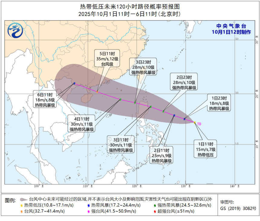 10月3日夜间至6日白天,受热带气旋影响,南海中北部海面、广东中西部海面、琼州海峡、北部湾海面风力自东向西先后加大到8级或以上。