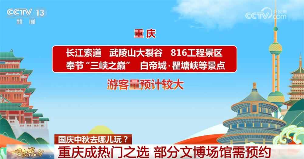 从目前旅游订单预订情况看,长江索道、武陵山大裂谷、816工程景区、奉节“三峡之巅”、白帝城·瞿塘峡等景点游客量预计较大,计划前往的游客务必提前规划好行程。