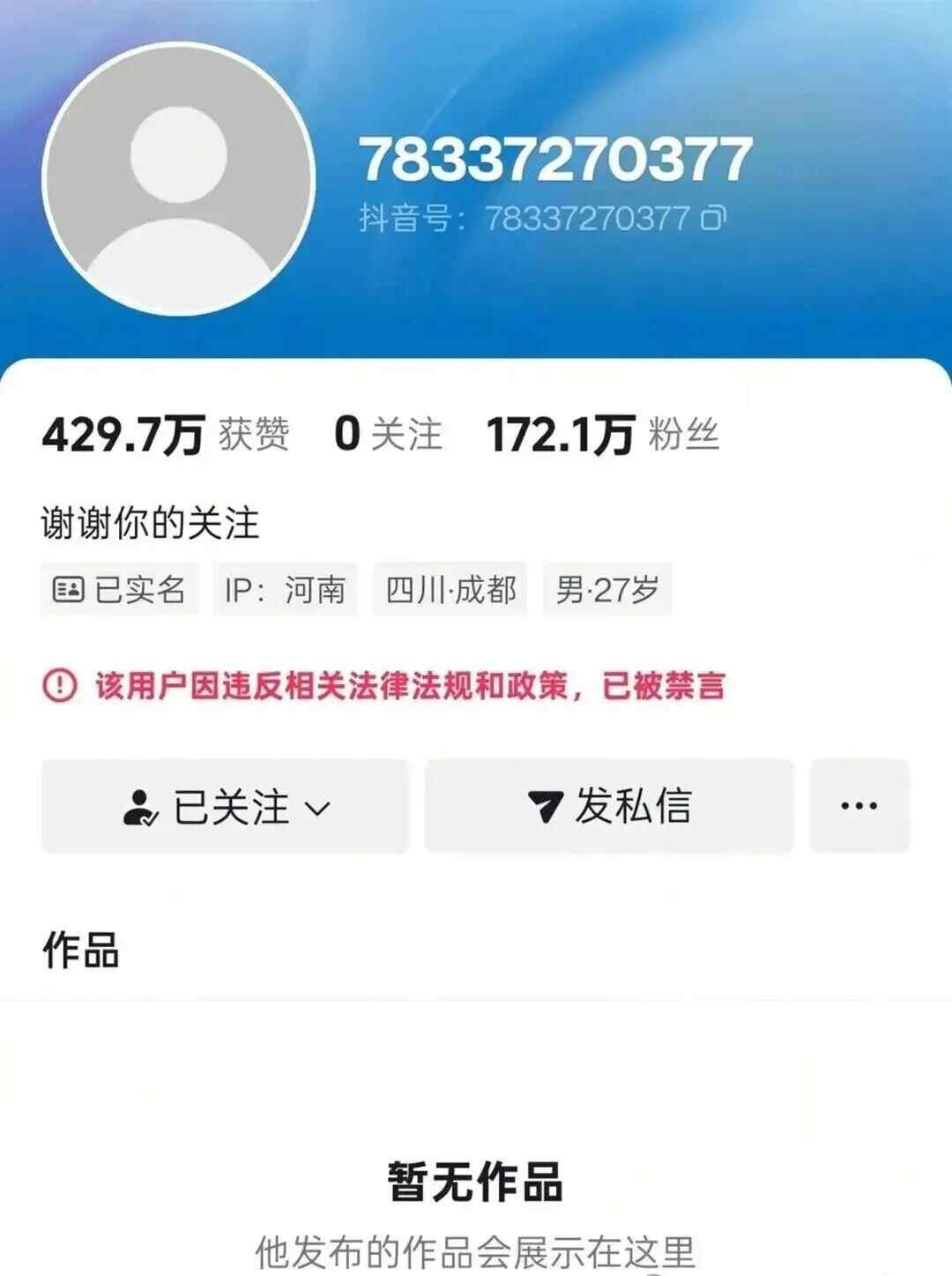 其抖音账号页面显示:该用户因违反相关法律法规和政策,已被禁言。账号头像变灰,昵称变为一段数字。