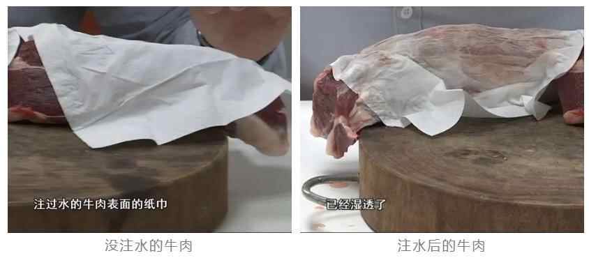 可以用卫生纸进行测试,注水牛肉5秒钟左右就能让卫生纸湿透,而合格牛肉上的纸巾只会留下少许油渍。