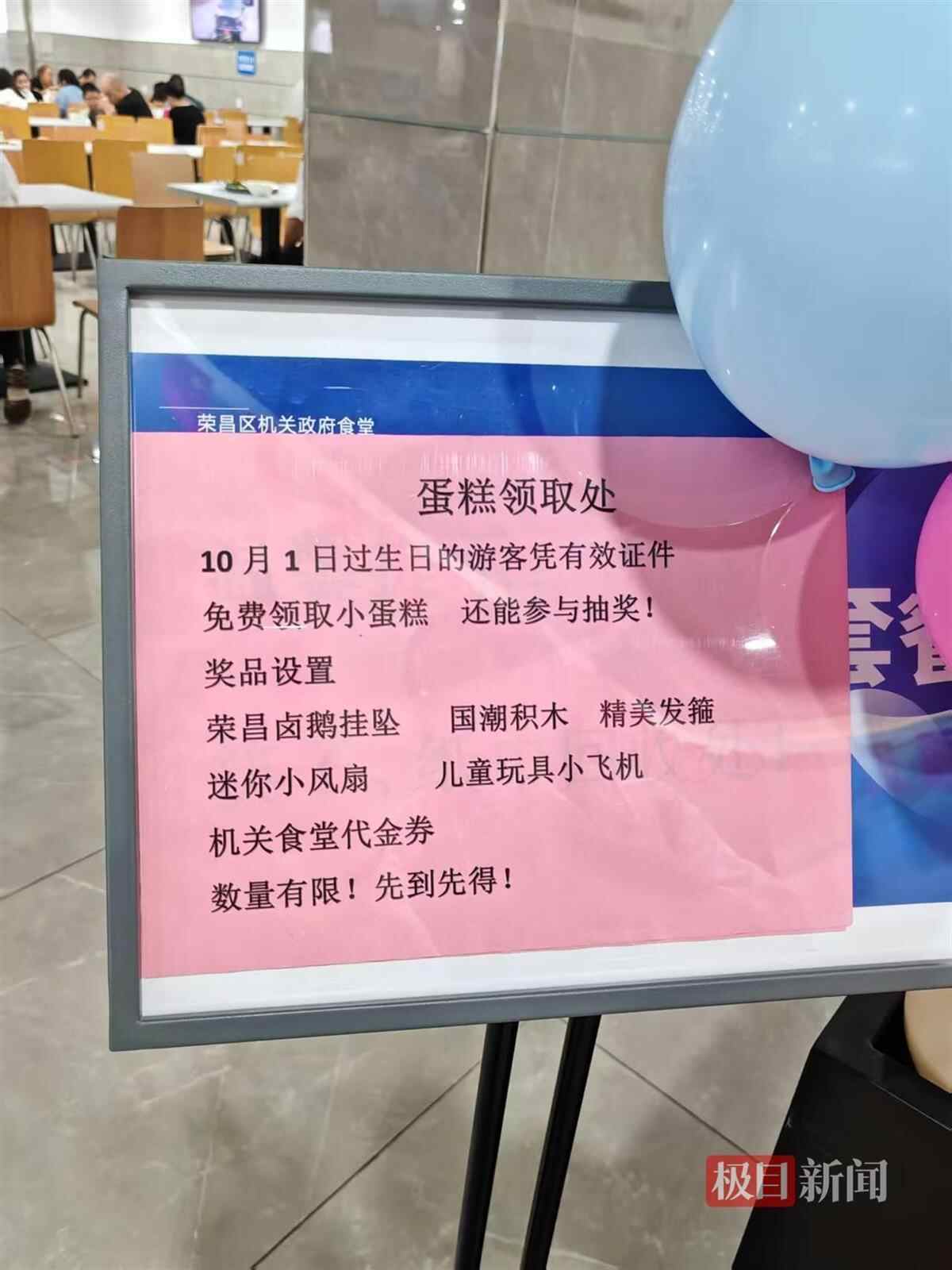 记者从荣昌有关部门获悉,食堂准备了荣昌多样特色美食,如荣昌卤鹅、黄凉粉、猪油泡粑等美食。此外,如果在食堂用餐且恰逢生日,凭有效身份证件,可免费领取小蛋糕一份,还能参与抽奖。