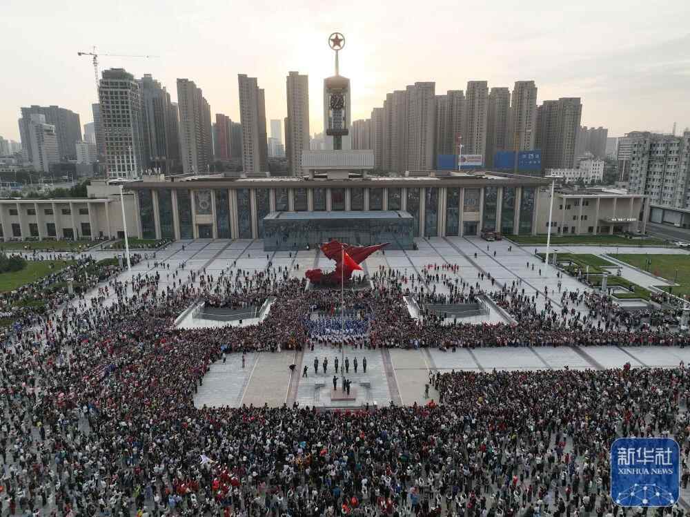 ↑ 10月1日,人们在河北省石家庄解放广场参加升旗仪式(无人机照片)。新华社发(梁子栋摄)