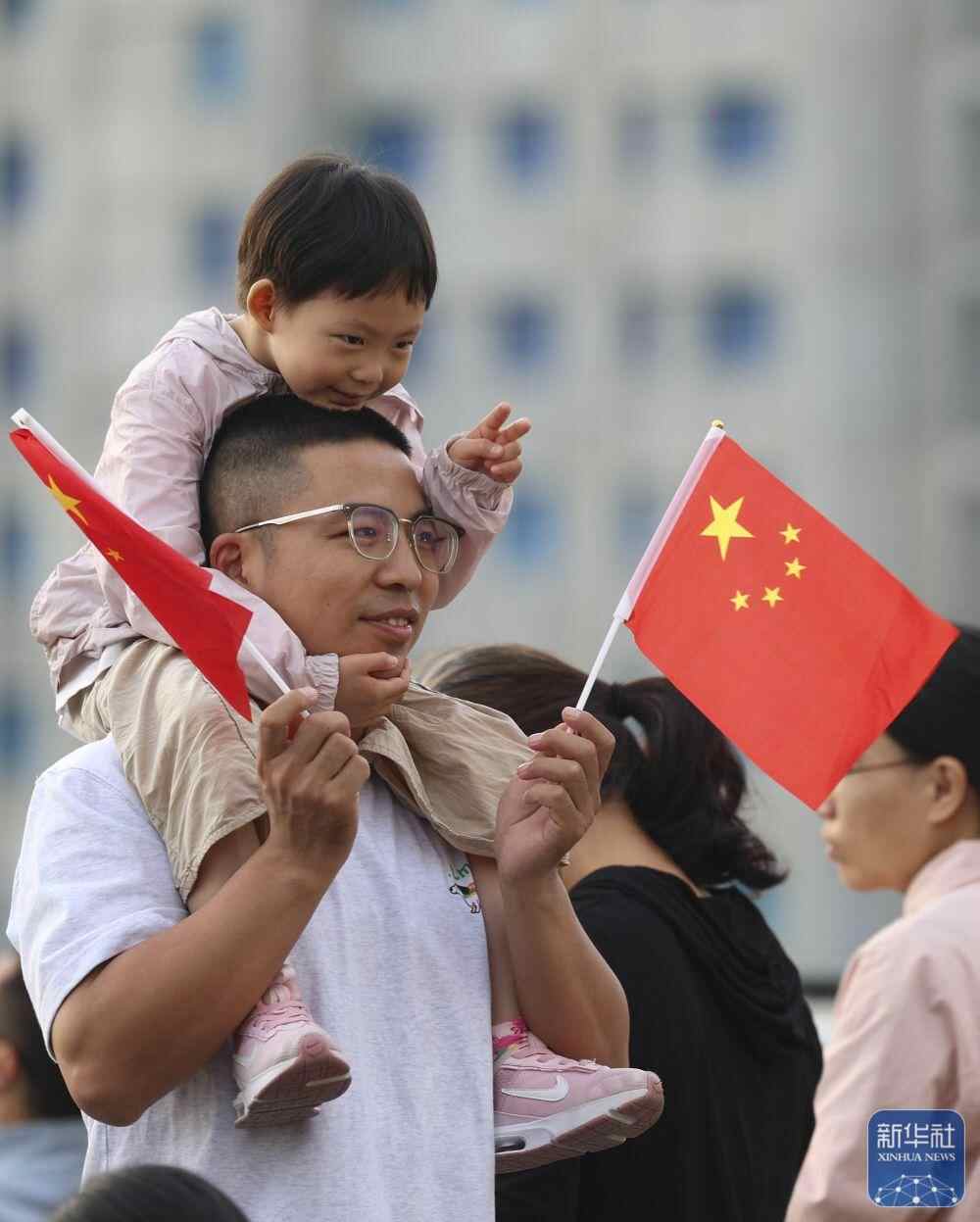 ↑ 10月1日,在上海中共一大纪念馆,一名小女孩坐在爸爸的肩膀上观看升旗。新华社记者 刘颖 摄