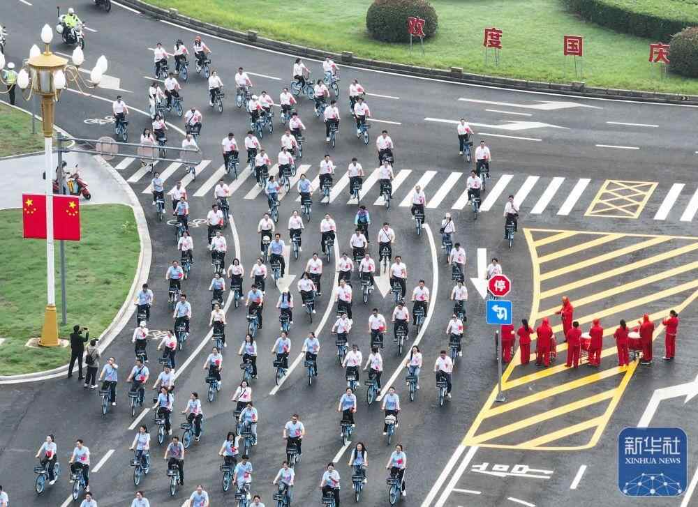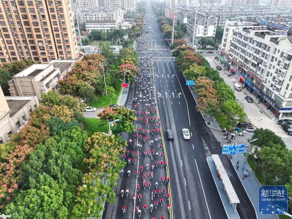↑ 10月1日,江苏省淮安市盱眙县举行“共贺祖国华诞”绿色骑行活动(无人机照片)。新华社记者 季春鹏 摄