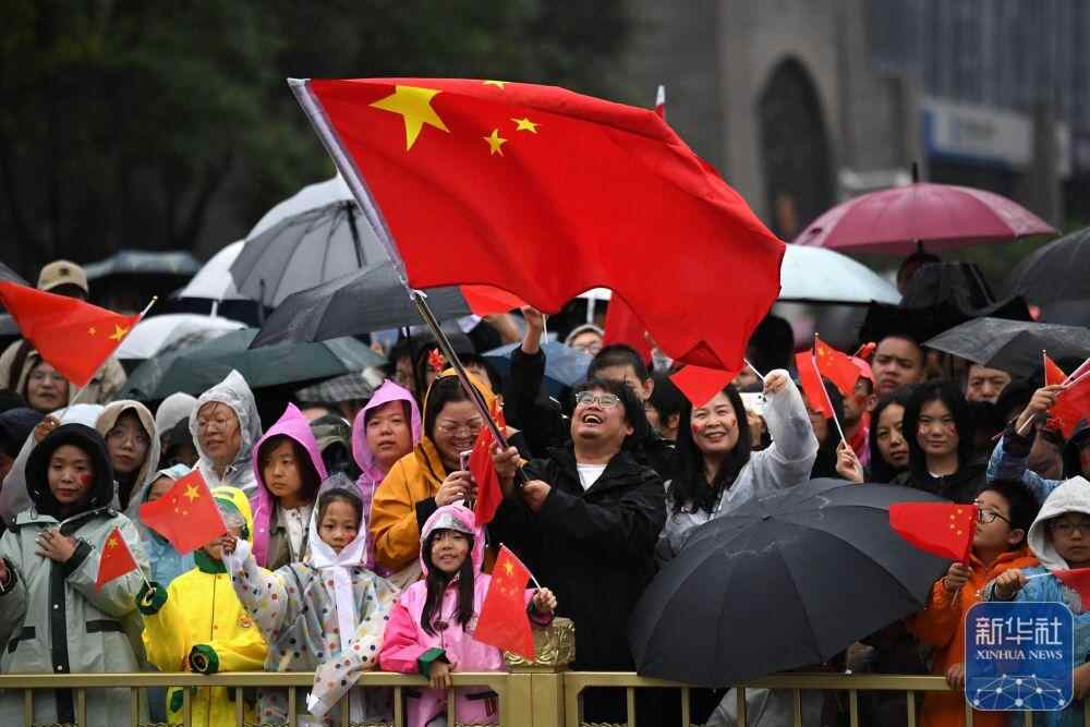 ↑ 10月1日,人们在陕西省西安市新城广场观看升旗仪式。新华社记者 李一博 摄