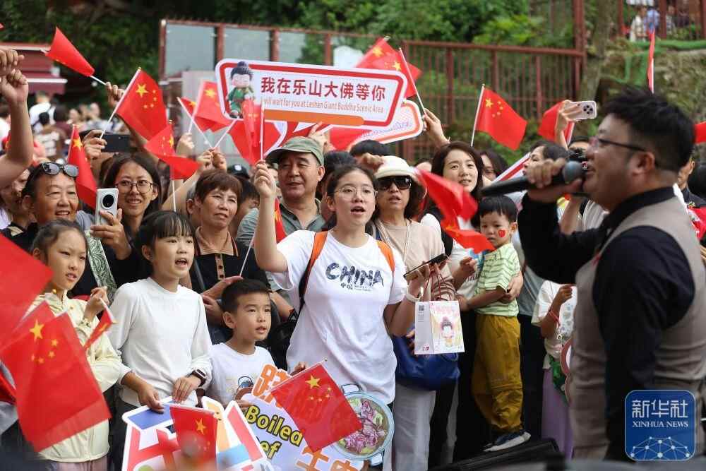 10月1日,游客在四川省乐山市大佛景区佛头广场合唱歌曲《我和我的祖国》。新华社发(李华时摄)