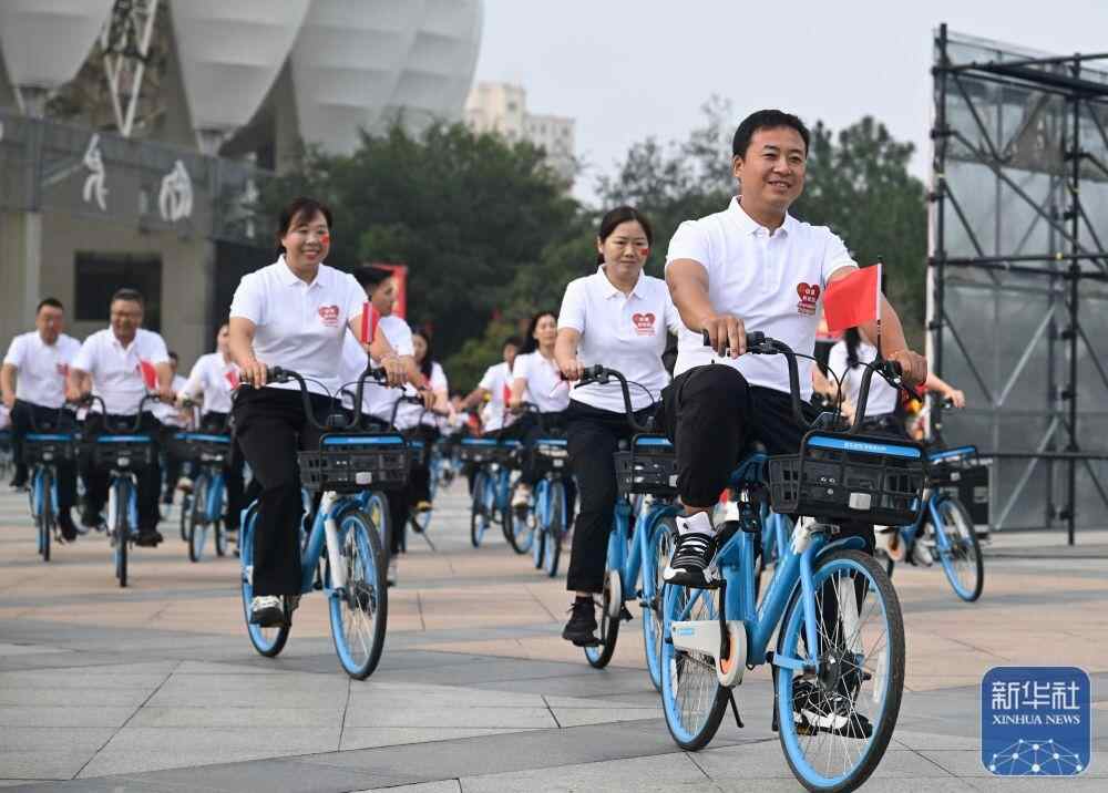 ↑ 10月1日,江苏省淮安市盱眙县举行“共贺祖国华诞”绿色骑行活动,参与者骑车出发。新华社记者 季春鹏 摄