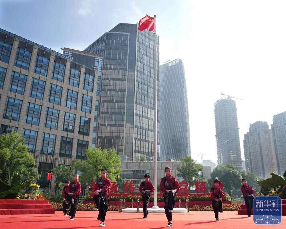 ↑ 10月1日,在上海中共一大纪念馆前举行的文艺演出中,小朋友在表演舞蹈《男儿当自强》。新华社记者 刘颖 摄