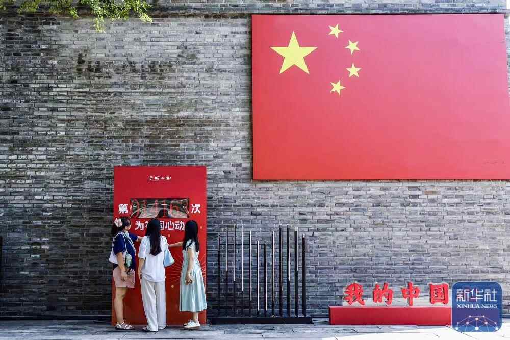 10月1日,在浙江嘉兴市南湖区建设街道子城城墙边,市民参加我为祖国心动打卡活动。新华社记者 徐昱 摄