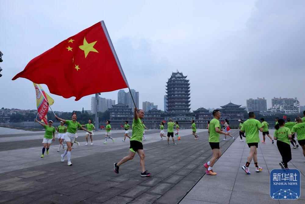 ↑ 10月1日,在四川省眉山市东坡城市湿地公园,健跑爱好者参加庆祝祖国华诞的“10.01公里”长跑活动(无人机照片)。新华社发(姚永亮摄)