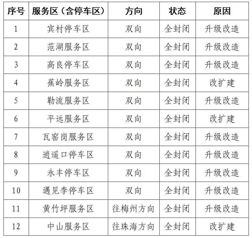 受二广高速铜锣营至鹤塘互通立交路段路面二期工程施工影响封闭,往广州方向福堂至小三江段高速主线、广州方向福堂入口匝道、连贺高速往广州方向匝道封闭,10月6日至10日开放。