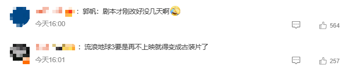 还有网友调侃,《流浪地球》系列导演郭帆刚改完剧本又要改了,第三部要是再不上映就得变成古装片了。