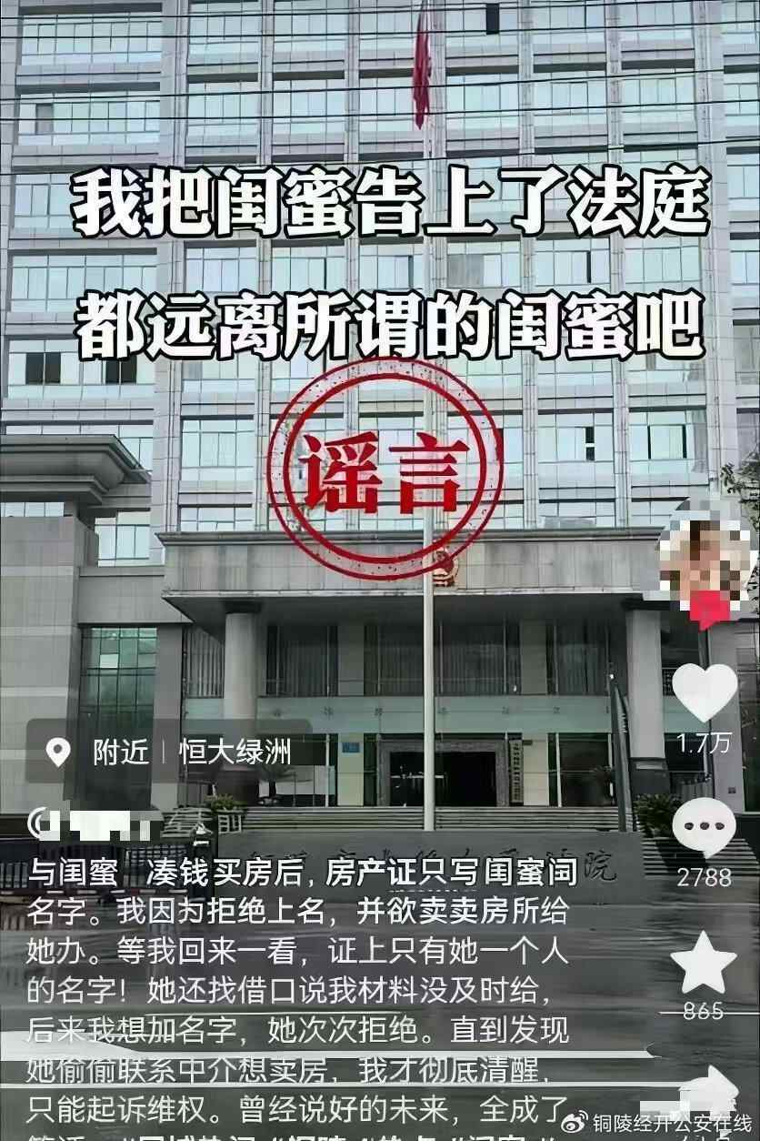 2025年9月15日,一网民在某社交媒体平台发帖称:“我把闺蜜告上了法庭,都远离所谓的闺蜜吧”,贴文中详细描述与闺蜜合伙买房后维权的经历,并视频配上一段铜陵市中级人民法院大门视频。该信息一经发布被大量转发,引发公众热议。