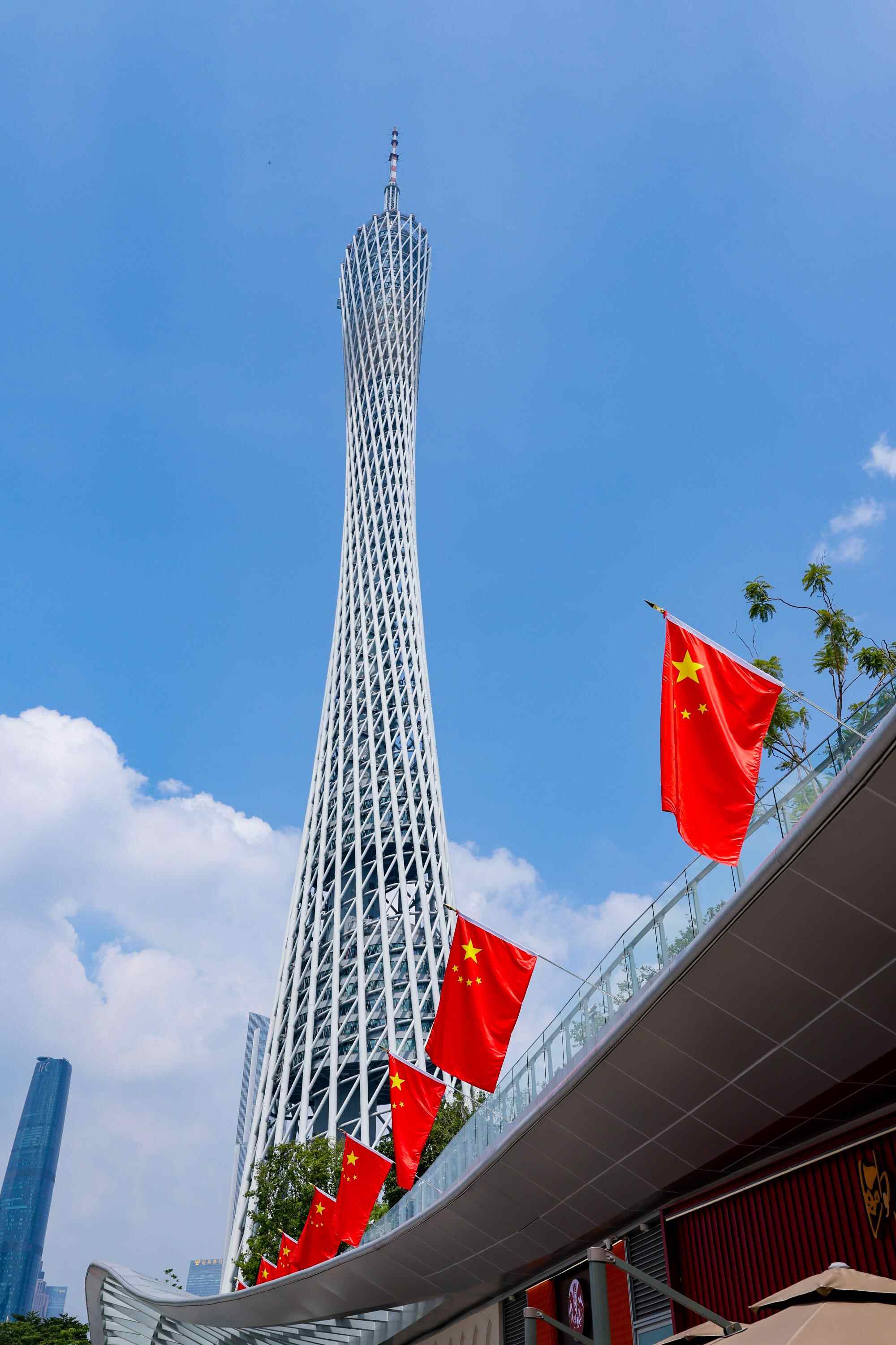 广州塔国庆期间还设置了多个主题打卡装置,游客执红旗与城市地标热情合影。