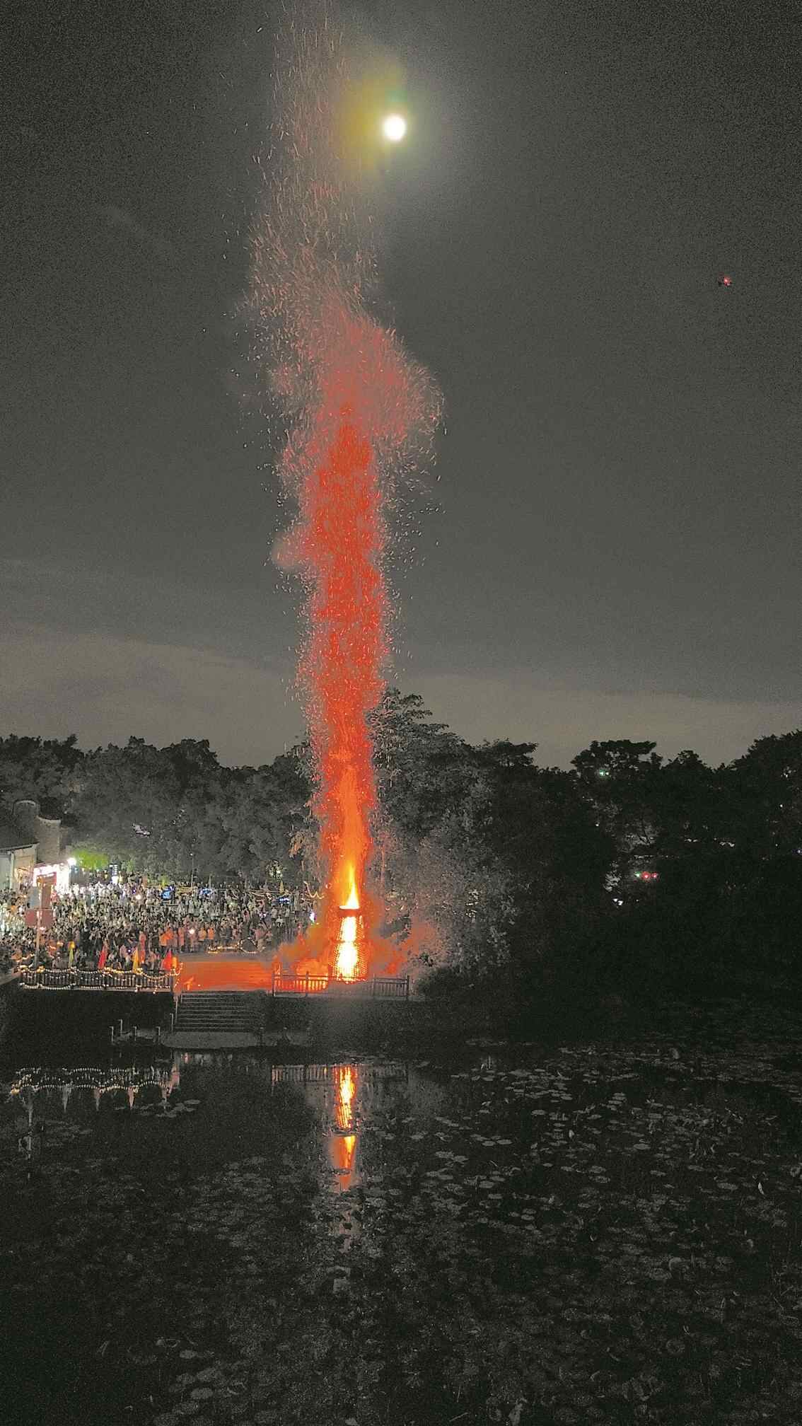记者了解到,烧禾楼又叫“烧番塔”,即将柴火倒入砖瓦堆砌的塔楼中点燃,其间泼盐助燃。禾楼燃至最盛时,火舌狂舞、火星四溅、火光冲天,引得在场众人惊叹欢呼,皆因“‘烧禾楼’的火花越多越高,寓意来年越好越红火”。