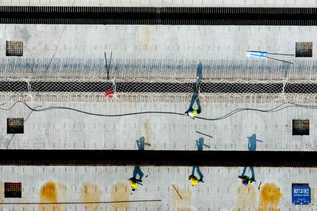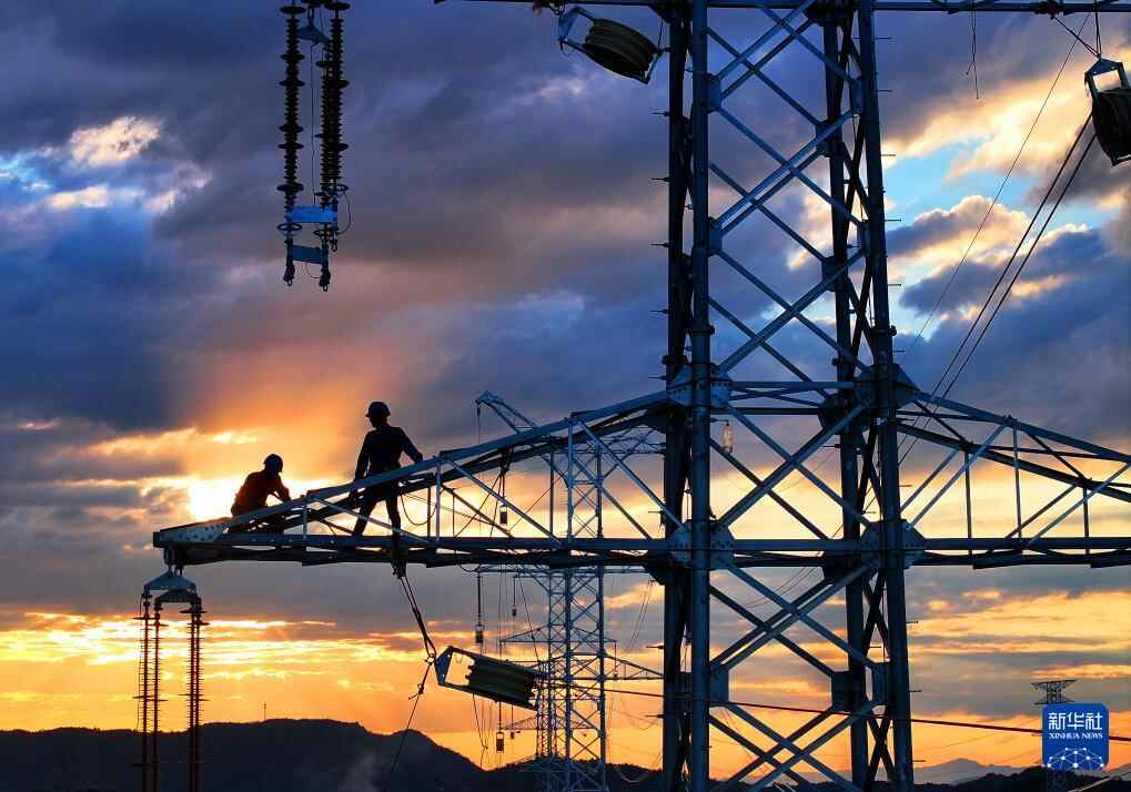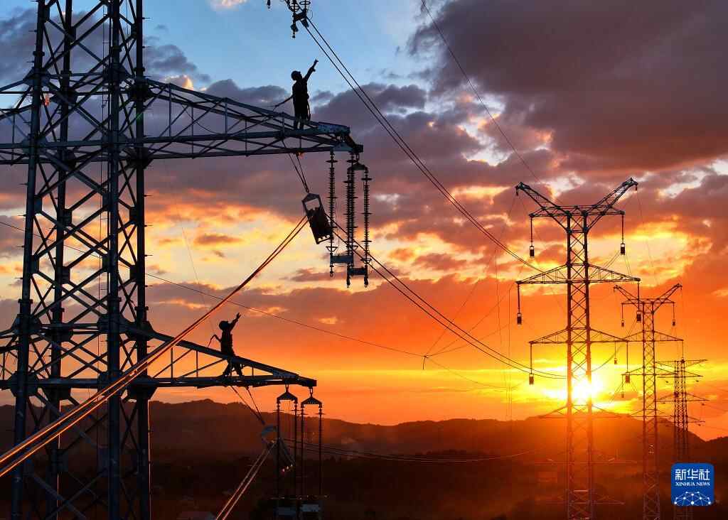 10月6日,在湖南省衡阳市雁峰区南三环路上,湖南雁能建设集团有限公司的施工人员在高塔进行架线施工作业(无人机照片)。