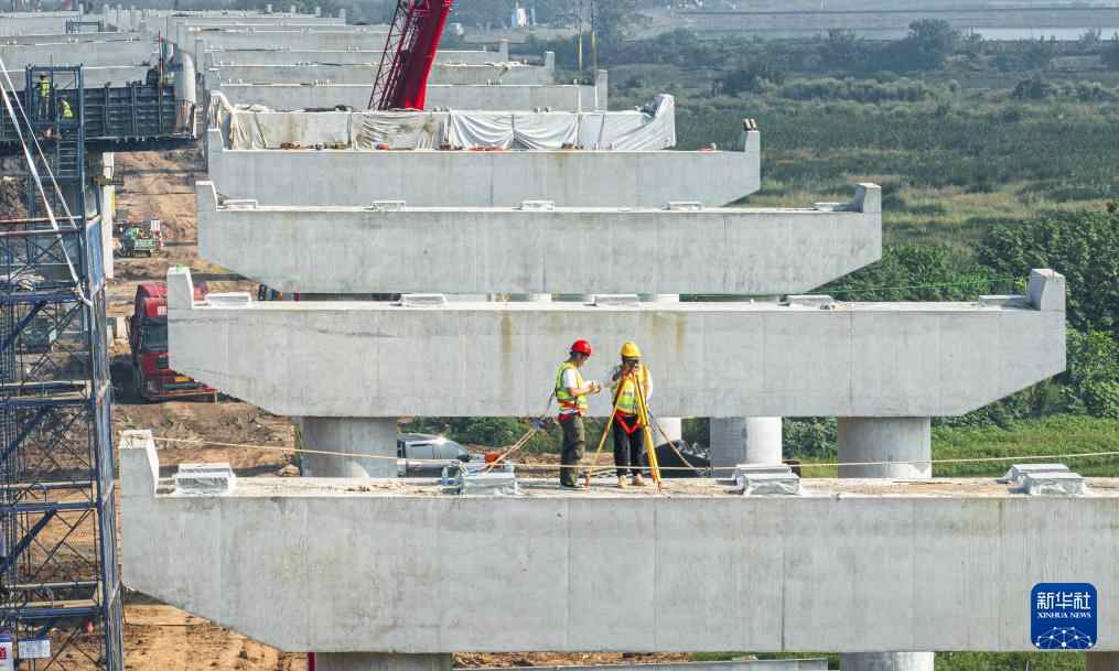 10月6日,在武汉都市圈环线高速公路孝感南段4标项目上,中铁二十局建设者进行施工作业。