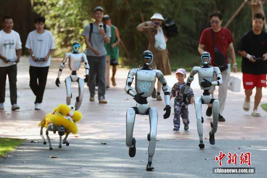 10月6日,江苏南京,“机器人”带领游客们一起奔跑。国庆假期,南京汤山紫清湖旅游区上演文旅大戏,“机器人”跳舞、“机器狗”舞狮……精彩纷呈,吸引市民和游客在舒适的环境中快乐度假。